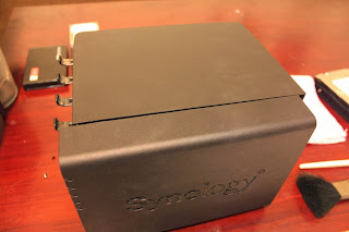 為了要清DS413,開條新抹布來擦好了,接著將後方的二顆機殼螺絲拆了,準備清內部,
